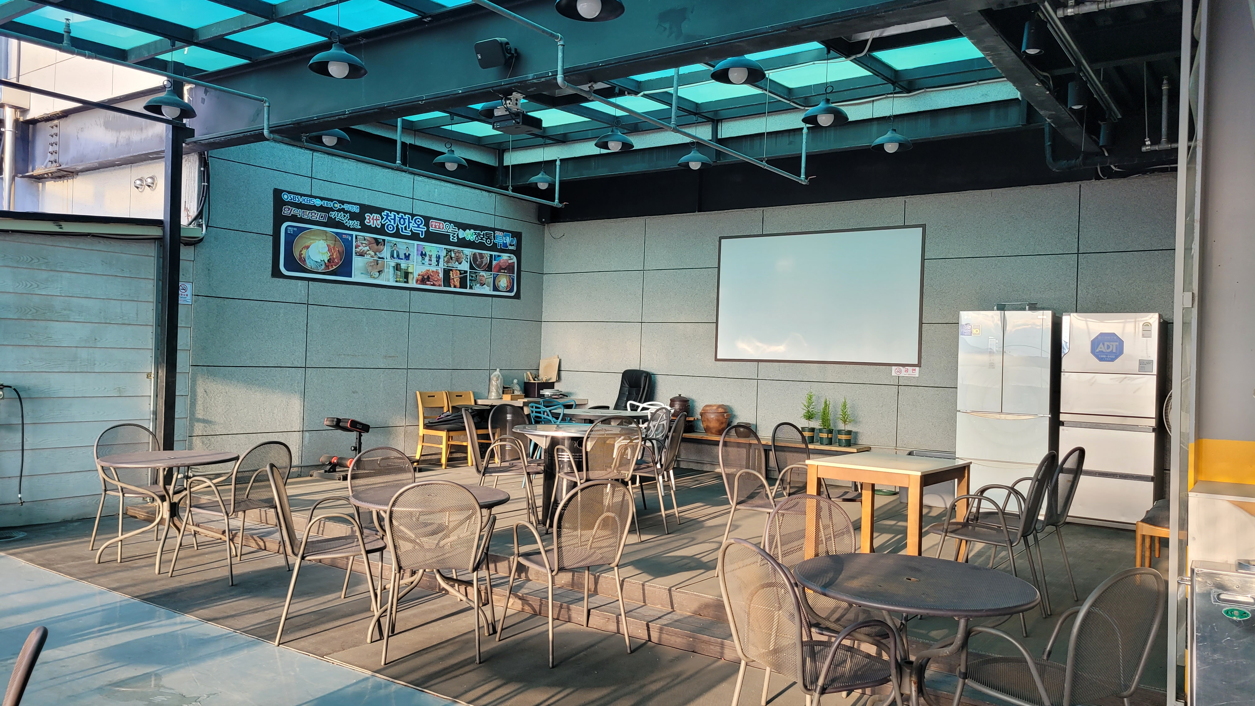 안쪽이 훤히 들여다 보이는 오픈주방과 넓고 전망이 좋은 홀의 모습이다. 겨울철 이외에는 야외공간에서 식사도 가능할것 같다.